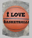 Orange basketboll med svarta remsor mot en grått-betongbakgrund. Jag Kärlek Basketball är skriven i svart text med roliga, studsande ögonbullar. Originalfotografi och offert © 2012, 2017 TamiraZDesigns.