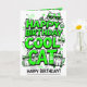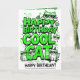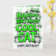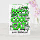 Med det här feta och lekfulla födelsedagskalkkortet "Coola Cat", säg önskemål på födelsedag! Den här illustrerade grönten är full av roligt, stil och kattdjur. Med graffiti-inspirerad text staplad hög och krånglig kattunge-text som genomsyras på skateboardtavlor och party-hattar är det purfektkortet för kattälskare, barn, tonåringar eller någon som bara är för coola för ett vanligt födelsedagskort. Med en ren vit bakgrund med en skarp palett med grönt, ger det här höga kortet energi, humor och många pawsitiva vibes till alla födelsedagskalender.