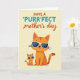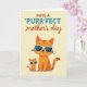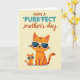 Det här kortet visar två stiliserade katter centrerade mot en mjuk, krämgul bakgrund, placerade tätt ihop på ett sätt som antyder en omtänksam relation ❤️. Den större katten sitter upprätt med orange päls och varma bruna ränder, medan den mindre katten speglar posen strax till vänster om den större, lutad in i det delade ögonblicket som en betrodd följeslagare. Båda bär snygga vita solglasögon, vilket ger ett vänligt och avspänt uttryck som känns som ett skämt mellan dem. Nära toppen är huvuddtexten arrangerad i två stilar, med ordet ”PURR” som sticker ut i ljust turkos för en lättsam betoning. Resten av frasen visas i en flytande rödbrun stil, med ”mother’s day” i mindre typ under, vilket håller fokus på katterna nedanför 🌼. Layouten känns balanserad, med generöst utrymme runt figurerna så att deras lugna uttryck och närhet genomsyrar stämningen. Subtila nyanser och jämna, förenklade