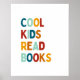 En ljus och färglös poster för bibliotek eller läsnook i skolan. Med ord läser "Coola children bokar" i modern, flerfärgad typografi. Den här verstildesignen är perfekt för en rad ställe, inklusive barnsovrum, läshörn eller hemskolesrum.