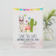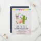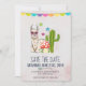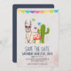 Spara datumkortet med en buntbanderoll i finare längst upp. Illustrerad med ett sött lampa med hjärtformade solglasögon och några stjärnor, ett svamprum och en grönt cactus. Vit och söt.