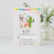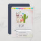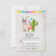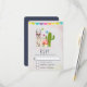 En OSA kort med en finare buntbanderoll längs toppen. Illustrerad med ett sött lama med hjärtformade solglasögon. Några stjärnor, ett svamprum och en grönt kaktuerar illustrationen. Vit och söt.