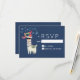 En OSA kort med en lustig illustration. En söt lama med svarta solglasögon och en röd tomhatt. Även med en sydamerikansk formad filt och pom-poms. Ord Joy skrev över huvudet i ett festivt färgstarkt teckensnitt. Blue snöflingor faller ner. Ställ in på blå bakgrund. Könsdesign och roligt jultema.