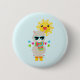 En knapp med en coola tittar lampa med mörk solglasögon. Förtryckt i en färglös, strimlad scarf och små roligtar. En ljus gult sol med lycklig kawaii ansikte i bakgrunden. Viktiga färglösa trianglar omger denna roligt som älskar lama. Blå bakgrund.