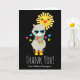 Tack för hälsningskort med en coola som tittar lampa med mörk solglasögon. Förtryckt i en färglös, strimlad scarf och små roligtar. En ljus gult sol med lycklig kawaii ansikte i bakgrunden. Viktiga färglösa trianglar omger denna roligt som älskar lama. Svart bakgrund.