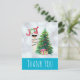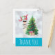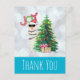 Jultack, vykort. En lustig illustration. En söt lama med svarta solglasögon och en röd tomhatt. Stå bakom en Julgran med festligt presenter. Ord Joy skrev över huvudet i ett färgstarkt helgdag. Bältesbakgrund i silver med isigen blå gräns. Könsdesign och roligt jultema. Meddelande på baksidan som du kan anpassa.