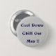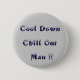 En anpassningsbar-knapp som läser > Coola Down Chill Out man!! på en vit bakgrund med frostiskt snö som typsnitt. En attitydavrådsknapp som är lämplig för någon med ilska eller ångest