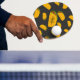 Anpassa den unika pongutrustningen med din första och namn. Coola och roligt taco mönster på mörk grått-bakgrund. Din vektorillustration gjord med tortilla i toastisk form med kött, sallad, tomatos och kål.