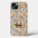 Anpassa mobilt tillbehör med ditt första och namn. Coola och roligt pizzabasar mönster på lätt grått. Juicy vector tillverkad pizza med crust, ost, salami, champignon-svampar, oliver och en sprinkl av oregano.