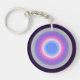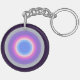 Nyckelkedjan har en cirkelformad design med en serie koncentriskt ringar i pulserande färg. Det yttersta ring är mörkens lila, som övergår inåt genom skuggor av rosa, ljusblå och en ljusblå cirkel i mitten. Konstruktionen ställs in mot en glansig, genomskinlig bakgrund som är fäst vid en standardnyckelring i metall med en kedja.