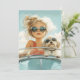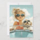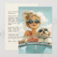 En snyggt ung flicka och hennes fluffy hund njuter av en solig väg resa, som båda bär solglasögon, och som undgår självförtroende och glädje.