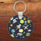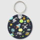 En nyckelkedja med ett sött och färglöst mönster med alla typer av rymden temat inslag. Bilder omfattar astronauter som flyter runt i sitt vita utrymme kostym. Stjärnor och planeter och coola fraktaser, rymdskepp och satelliter. Roligt och galen design.