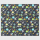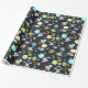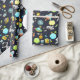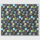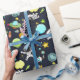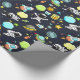 Föråldrad förpackning papper med ett sött och färglöst mönster med alla typer av inslag med temat rymden. Bilder omfattar astronauter som flyter runt i sitt vita utrymme kostym. Stjärnor och planeter och coola fraktaser, rymdskepp och satelliter. Roligt och galen design.