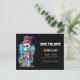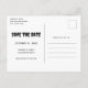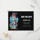 Spara vykortet för datum med en illustration av ett humoristiskt skelett. Ta en drink med top hat. Han har ett stort leende på ansikte. Cute och spooky roligt för Halloween.