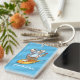 En akryl nyckelring eller en nyckelkedja med en coola av is som är försedd med en polar av kall och en kylhand fläkt och som håller på att köra en surfa av ljus gult. En nedkyld design för sommaren, som ligger på en ljusblå standardbakgrund som kan ändras före köpet om så önskas. Vågen mönster visas som en mörkare ton av den valda bakgrunden färg. Ändra standardtexten till det meddelande eller den bildtext du föredrar.