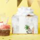 Whimsical tomte, palmer, ananas på bokeh-bakgrund gör detta till ett perfekt jul- eller högtidskort för vänner och familj.