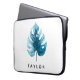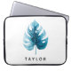 Modern laptop sleeve-design med ursprungligen handmålad vattenfärgad monstera löv på vit bakgrund. Text är anpassade.