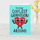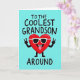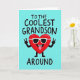 This greeting card shows a bright red heart character front and center, wearing white sunglasses and sticking out a cheeky tongue 🥰. Its two dark hands are raised on either side, each making a peace sign, which gives the whole scene a fun, confident feel. The background is a strong aqua blue that makes the red heart and dark details stand out. Above the heart, the words “TO THE COOLEST” appear in black, thick, simple all-caps letters. Below the heart, the rest of the message reads “GRANDSON AROUND,” in the same black all-caps style, so the character is framed by the text. It feels meaningful because it’s a light, affectionate way to tell a grandson he’s loved and admired without being too serious ❤️. It’s an easy card to give when you want to share on Valentine’s Day.