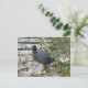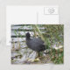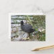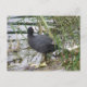 Det här vykortet innehåller ett foto av en Coot som står på en flods strand. Fågeln är svart med ett vitt plåster på huvudet. Nacke har vänt och tittar över sin axel mot vegetationen på flodbanken.