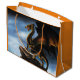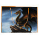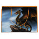 En stor drake med koppar-, guld- och svarta skalor på ett klippt kant med blå himmel på baksidan.
