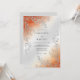 This design features a striking copper and burnt orange watercolor wash that evokes the warmth of a crisp autumn sunset. Delicate silver metallic-style leaf branches and tiny blossoms drift across the composition, creating an ethereal and polished aesthetic. The botanical elements resemble fine wax flowers and eucalyptus sprigs, perfect for a sophisticated harvest-themed event. The rich color palette brings a sense of modern elegance to any seasonal nuptial.
