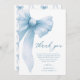 Tillsätt en touch av mjuk charm till din efterfest-tack med detta Coquette Blå Slinga Bröllopsfest Tackkort. Med en delikat pastellblå slinga, subtila blommor och elegant skrift, kompletterar detta kort perfekt en feminin och romantisk bröllopsfesttema. Oavsett om du tackar gästerna för deras kärlek, närvaro eller genomtänkta gåvor, förmedlar detta kort ditt meddelande med tidlös stil och sötma.