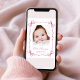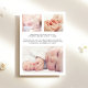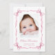 Ett sött kort för att informera om ditt flicka födelse med foto i en vattenfärg ram som består av rosa delikat rosett band och kokvetbågar och som blandar ett minimalt estetiskt med en aning finstilt vintage. Hennes namn är utvisad i ett skript för elegantens rosa och hennes födelsedag och födelsestatus är i klassisk serif-typografi. På baksidan lägger du till ytterligare tre foton och anpassar ditt meddelande till familj och vänner.