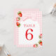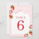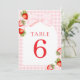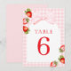 Coquette Jordgubbs Bordskort. Med ett förtjusande jordgubbtema, elegant röd skrivstil och mjuka vattenfärgstoner, är denna design perfekt för en vår- eller sommar-barnkalasfirande.