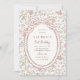 Charming coquette-style first birthday invitation featuring a delicate floral meadow pattern and an elegant pink bow detail. The scalloped oval frame and vintage-inspired flowers create a soft, storybook look perfect for a baby girl’s first birthday celebration. Inspired by cottagecore and classic heirloom designs, this floral birthday invitation is ideal for garden parties, spring birthdays, and sweet, feminine themes. A lovely choice for parents looking for a bow birthday invitation with a gentle meadow floral aesthetic.