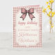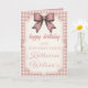 This Coquette Pink Bow & Gingham Sweet 16 Card is a stylish and feminine choice for a milestone celebration. The design centers around a large, vintage-style hand-drawn pink bow that perfectly captures the popular "coquette" aesthetic.