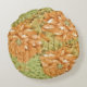 Grafisk design, av stor, fetstilt, koral-färgad, blomblomning, med vit tippning, petalemblazonerad, tvärs över en brun korall och grönt, löv yta.