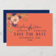 Rustik, elegant, rosa blomma i kombination med korallbakgrund och marin blå baksida. Enkel, vacker, modern inbjudan till bröllop spara datum.