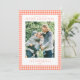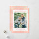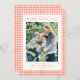 Create your own custom photo Christmas cards featuring one of your favorite family pictures alongside personalized minimalist typography name and year on a cute coral gingham plaid pattern background.
