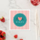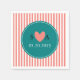 pappra servetter från bröllop. Utformningen har en alternerande korallisk rosa och vit rand mönster i bakgrunden. Utformningen har även bruds och rummets initialer åtskilda av ett rosa hjärta. En elegant strimlade mönster med monogram och i mitten finns en tealcirkel.