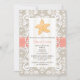 Söt strand och nautiskt termiskt inbjudningskort för möhippa med gult stjärnfisk, delikat snurrande gräns och ett tryckt korallkontraststband ser ut på en subtil, remsad bakgrund med en damm och hjärta mönster. Baksidan av den här möhippans inbjudan har ett vitt och koralt rand-seersucker-tryck. Art © Chrissy H. Studios, LLC. Alla Höger reserverade.