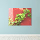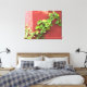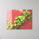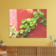 En grönt vin kryper runt en korallvägg och ett hörn. Kontrasten mellan färg är stimulerande. Vatten pärlor kan ses på vissa löv.