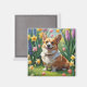 En glad hund sitter fredligt på lush grönt gräs, omgiven av färgfulla vår blommar under ett mjukt blå himmel. Den här digitala oljemålningen fångar upp ett ögonblick med uttryckliga penseldrag, varmt färg och en känsla av varm glädje.