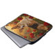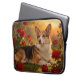 A tri-colored Corgi lying amidst red roses during golden hour. The scene is depicted with the rich texture and soft lighting of a classical oil painting.