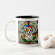 En Corgi som bär en tomtehatt portreras i nedfläckad glas.