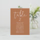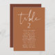 Bordsnumrets sittande diagram har ett edgy handskrivet typsnitt och modern minimalistisk utformning med en kombination av boho terracotta, rost och vit färg. Ändra enkelt antalet och namn tillsammans med hela färg så att det stämmer överens med din händelse.