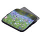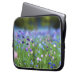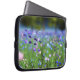 En fält av kornblommor i blek- och djupblåa nyanser, lila, lavendel och rosa, med löv av blek grönt.