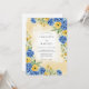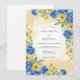 This design features a vibrant palette of royal blue and sunny yellow, creating a cheerful watercolor aesthetic. Lush hydrangeas and delicate ranunculus are accented by leafy greenery and small berries. A soft cream wash adds warmth to the artistic botanical arrangement. This floral artwork evokes the brightness of a seasonal outdoor ceremony.
