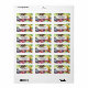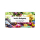 Adressetiketter med ett foto av ett bord fyllt med naturområde. Utsäde med kornuskopa, färgade skördegrönsaker och frukter.