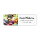 Adressetiketter med ett foto av ett bord fyllt med naturområde. Utsäde med kornuskopa, färgade skördegrönsaker och frukter.
