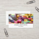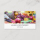 Affärskort med ett foto av ett bord fyllt med naturområde. Utsäde med kornuskopi och färgade skördegrönsaker och frukter.