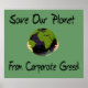 Planet Earth är förlöjligat i ett kärleksfullt par av händer med ord "Spara vår planet från företagsgirighet". Utan vår hjälp kommer planeten att förstöras av klimatförändringen och den globala uppvärmningen, som kommer av företagens girighet.