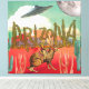 Modern Collage Wall Art. Den här är en vintage retro cowboypojke på en jackalope med kaktus "Arizona"-typsnitt, ufo och måne i molnet himlar. Lasten färg i vilda western. Roligt, mod och ektomisk ephemera. Det här är ett platt yta med en mjuk avslutat. Roligt, surrealistisk konst med en blandning av kollage och digital konst, med en vintage, halvsekelsretro.