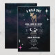 En inbjudan till babydusch med en illustration av en hjort i baby omgiven av stjärnor. Hjorten har rosor. Anpassa texten. Bakgrund är vattenfärgsinspirerad kosmisk design.