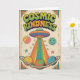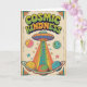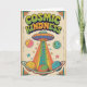 A cute and colorful cosmic-themed birthday card featuring a friendly UFO, smiling planets, and a rainbow beam full of hearts.
