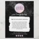 En vattenfärgsillustration av ett rosa måne omges av en himlar av stjärnor på denna svartvita flygare senast 1201AM. Ditt namn eller ditt företag namn är centrerat på måne för en unik logotyp. Den dubbla flygplanet ger gott om utrymme på baksidan för att befordra dina klasser, tjänster eller andra användor. Denna eteriska utformning skapades för yogainstruktörer, livstränare, astrologer, friskare, akupunktrister, reiki- och energiarbetare, eller för alla yrken som tittar en utformning av kreativet för deras verksamhet. Underbar till använda för prisa listor, tjänstmenyer, öppna hus, speciella evenemang med mera. Originalteckning och design © 1201AM Design Studio | www.1201am.com